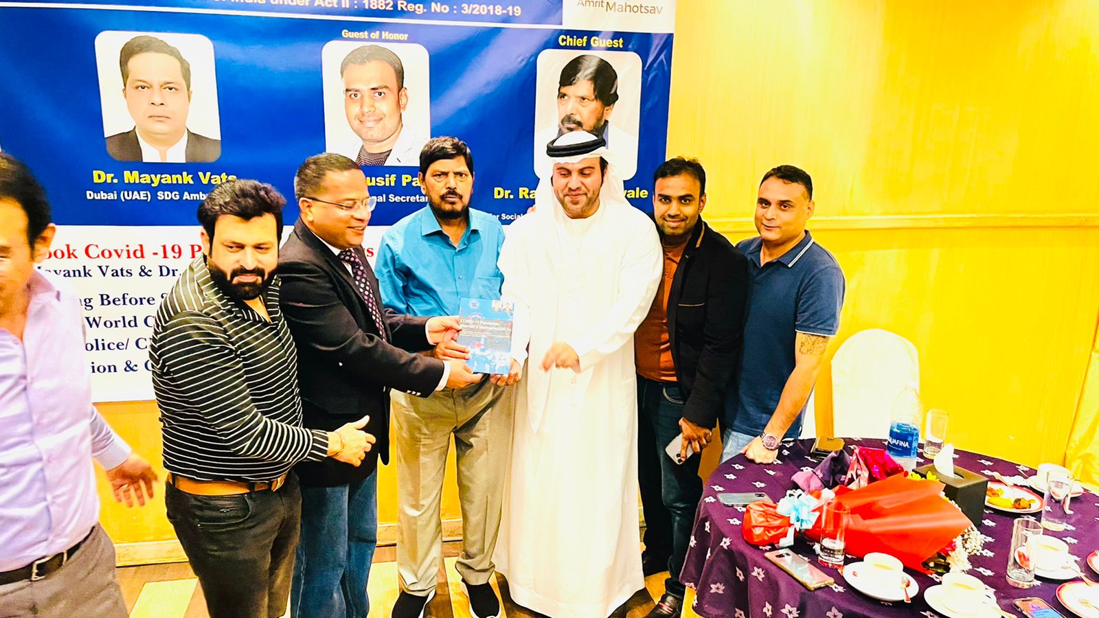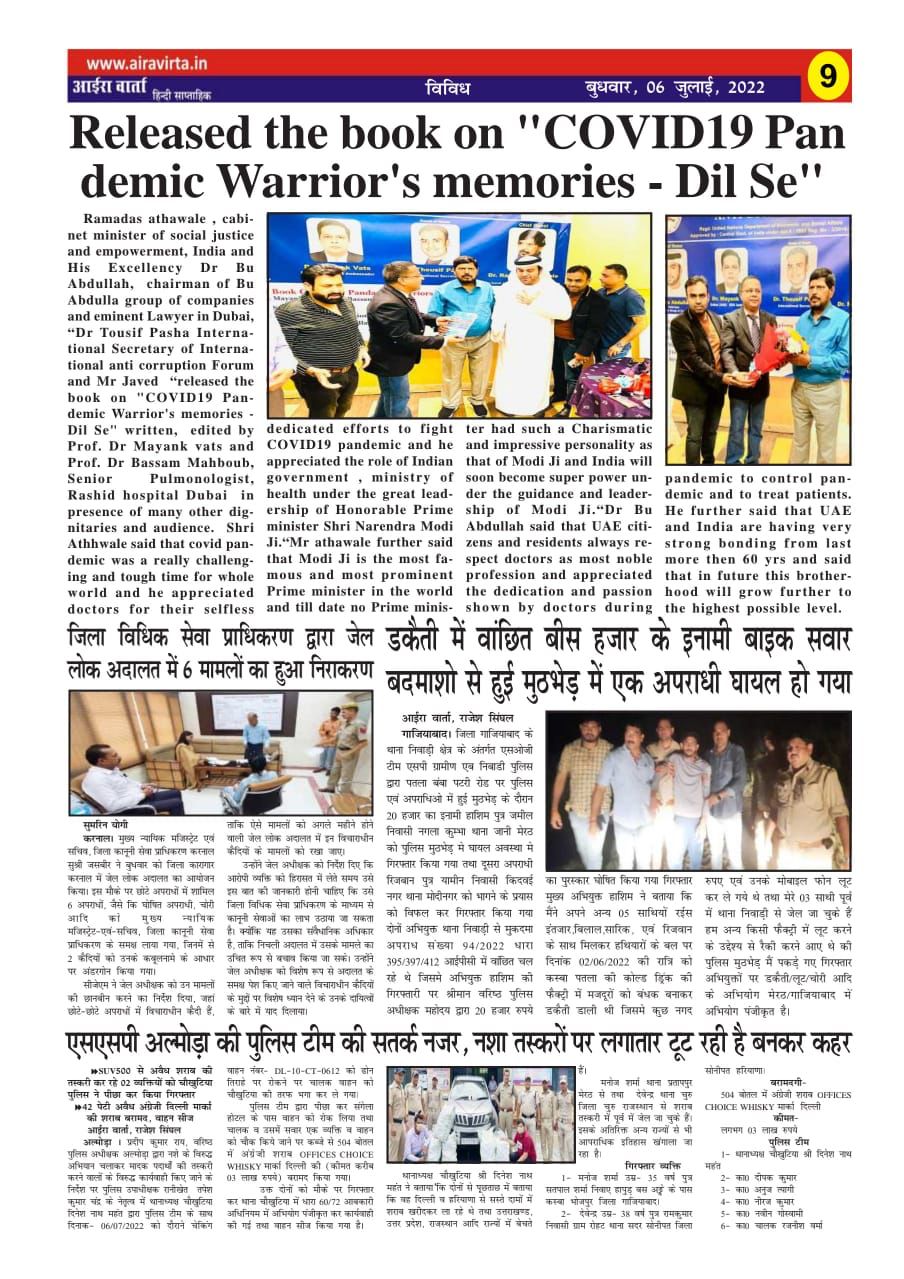 released the book on "COVID19 Pandemic Warrior's memories - Dil Se" written, edited by Prof. Dr Mayank vats and Prof. Dr Bassam Mahboub, Senior Pulmonologist, Rashid hospital Dubai in presence of many other dignitaries and audience. Shri Athhwale said that covid pandemic was a really challenging and tough time for whole world and he appreciated doctors for their selfless dedicated efforts to fight COVID19 pandemic and he appreciated the role of Indian government , ministry of health under the great leadership of Honorable Prime minister Shri Narendra Modi Ji.